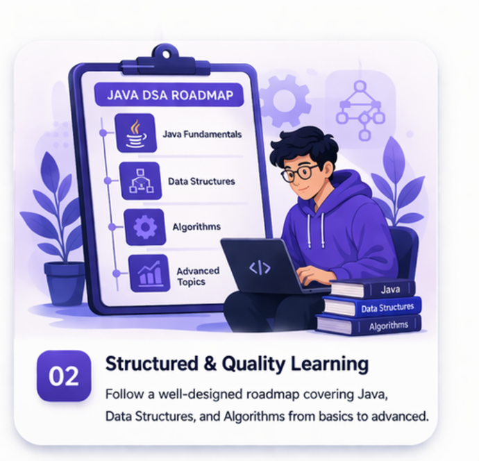 Follow a clear roadmap with expert guidance, hands-on coding practice, and real interview-level problems..